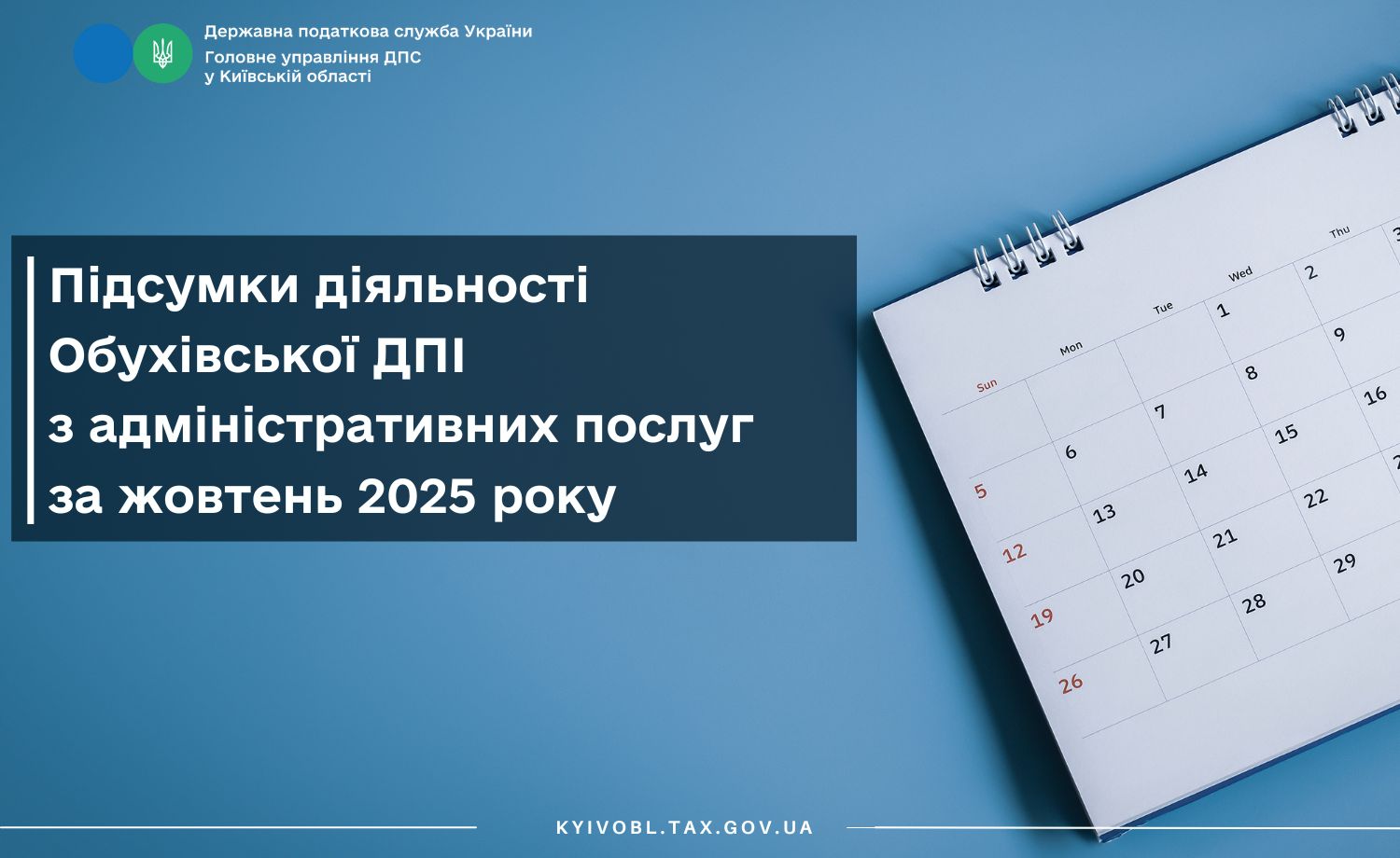 За жовтень 2025 року Обухівською ДПІ ГУ ДПС у Київській області надано 2020 адміністративні послуги. Найбільшим попитом користується адміністративна послуга з видачі картки платника податків, внесення до паспорта громадянина України даних про реєстраційний номер облікової картки платника податків з Державного реєстру фізичних осіб – платників податків. Протягом жовтня 2025 року видано 980 картки платників податків та внесення змін до реєстраційного номера облікової картки платника податків Державного реєстру фізичних осіб – платників податків. Внесення до паспорта громадянина України (у формі книжечки) відмітки про наявність права здійснювати будь-які платежі за серією та номером паспорта – 2. Видано відомостей з Державного реєстру фізичних осіб – платників податків про суми/джерела виплачених доходів та утриманих податків у кількості – 178 довідок.
