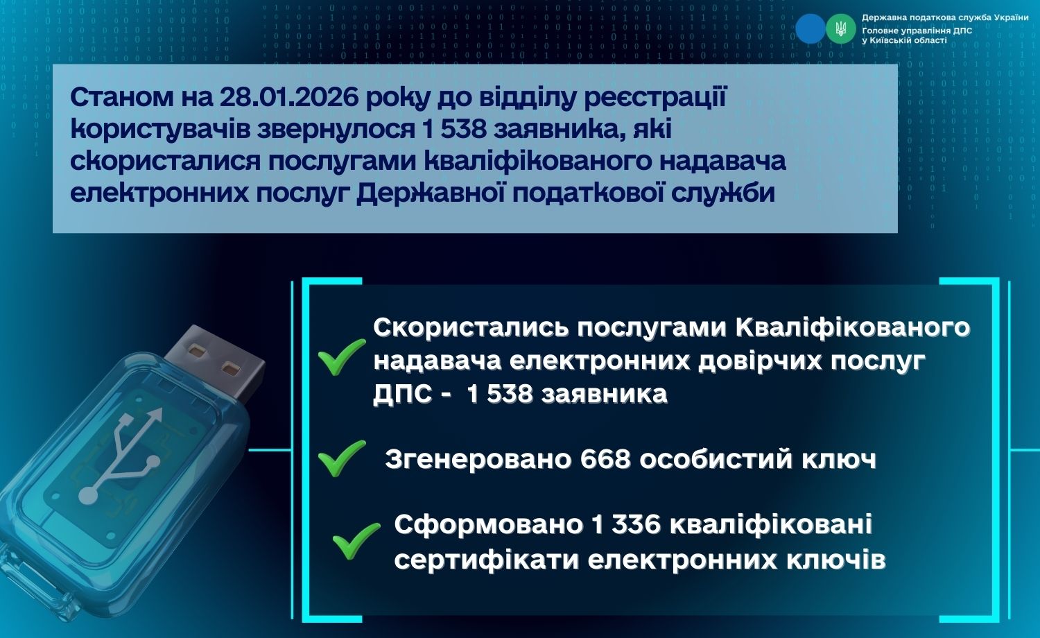 Станом на 28.01.2026 року до відділу реєстрації користувачів звернулося 1538 заявників, які скористалися послугами кваліфікованого надавача електронних довірчих послуг Державної податкової служби. При наданні кваліфікованих електронних довірчих послуг працівниками відділу згенеровано 668 особистих ключів підписувачів та сформовано 1336 кваліфікованих сертифікатів відкритих ключів електронного підпису чи печатки. Скасовано кваліфікованих сертифікатів за заявою про зміну статус кваліфікованих сертифікатів відкритих ключів 101 заявникам. Відділом надано консультації щодо отримання та застосування електронного підпису чи печатки, користування програмними засобами «ІІТ користувач ЦСК-1», повторного дистанційного формування сертифікатів за електронним запитом, завантаження кваліфікованих сертифікатів з сайту надавача та з інших питань.