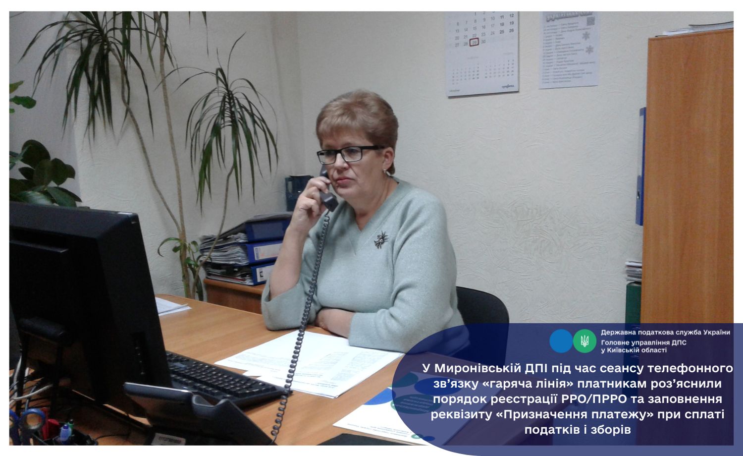 У Миронівській ДПІ під час сеансу телефонного зв’язку «гаряча лінія» платникам роз’яснили порядок реєстрації РРО/ПРРО та заповнення реквізиту «Призначення платежу» при сплаті податків і зборів