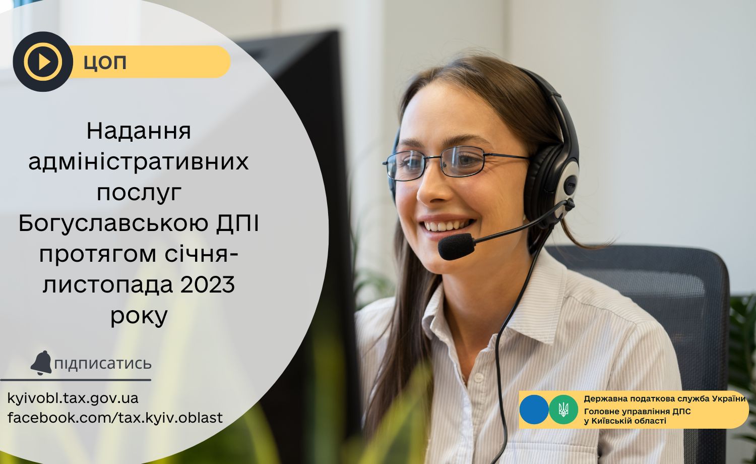 За січень - листопад 2023 року Богуславською ДПІ ГУ ДПС у Київській області надано 4222 адміністративних послуг. Найбільшим попитом користується адміністративна послуга з видачі картки платника податків, внесення до паспорта громадянина України даних про реєстраційний номер облікової картки платника податків з Державного реєстру фізичних осіб – платників податків. Протягом  січня - листопада 2023 року видано 1667 картки платників податків та внесення змін до реєстраційного номера облікової картки платника податків Державного реєстру фізичних осіб – платників податків. Видано відомостей з Державного реєстру фізичних осіб – платників податків про суми/джерела виплачених доходів та утриманих податків у кількості - 800 довідок.