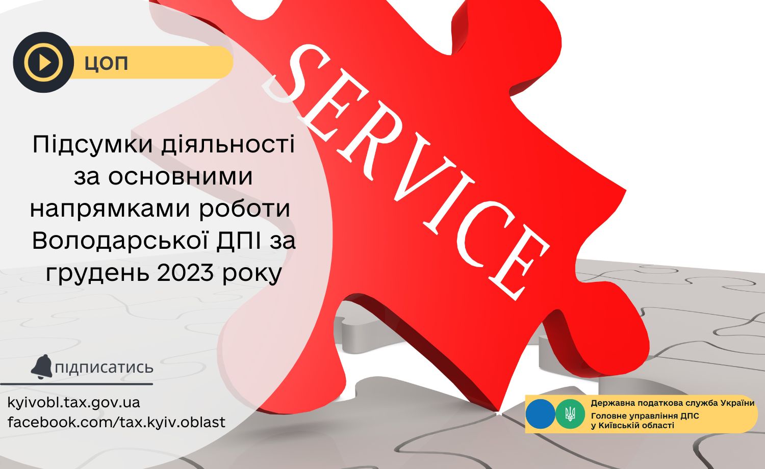 За 12 місяців 2023 року фахівцями Центру обслуговування платників Володарської ДПІ розглянуто 3184 звернення громадян щодо надання адміністративних послуг, з них 1218 надійшло в електронній формі. Надано протягом звітного періоду 3041 адміністративна послуга. За грудень надано 291 адміністративна послуга, в тому числі засобами телекомунікаційного зв’язку 69.
