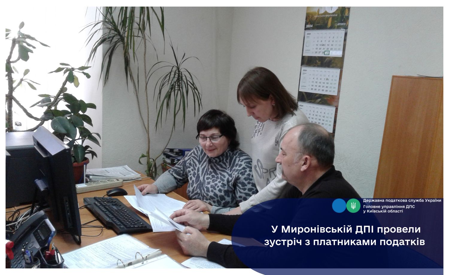 В.о. начальника Миронівської ДПІ Тетяна Яблонська цими днями провела зустріч з платниками податків, під час якої обговорювала особливості декларування доходів громадян у 2024 році та застосування електронних сервісів ДПС для подання декларації до податкових органів, зокрема, мобільного застосунку «Моя податкова».