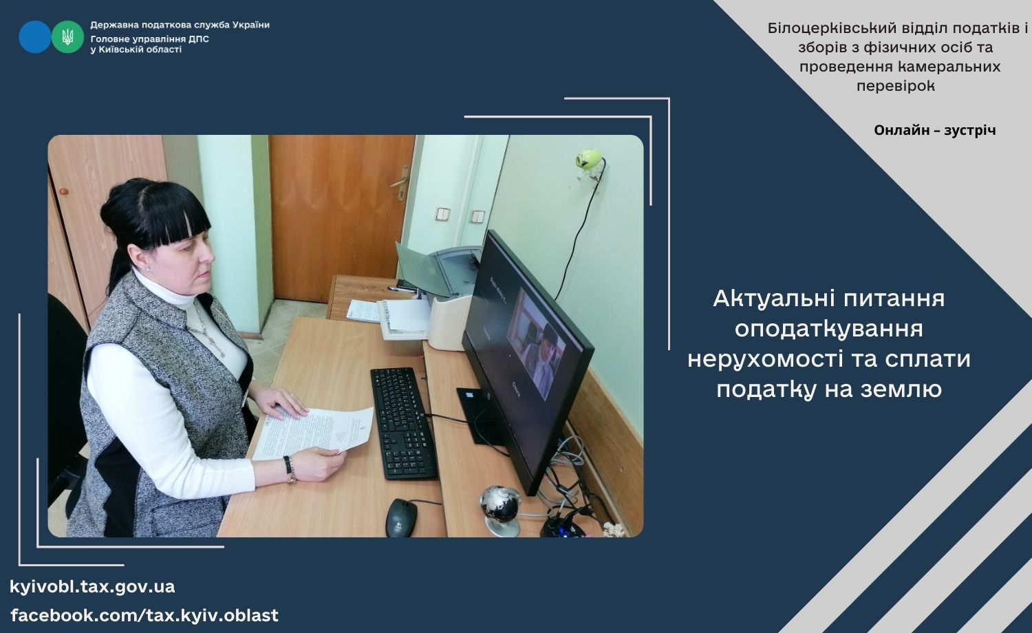 Нещодавно в.о. начальника Білоцерківського відділу податків і зборів з фізичних осіб та проведення камеральних перевірок управління оподаткування фізичних осіб ГУ ДПС у Київській області Леся Кравченко, провела онлайн - зустріч із фізичними особами. Обговорили актуальні питання оподаткування нерухомості та сплати податку на землю.