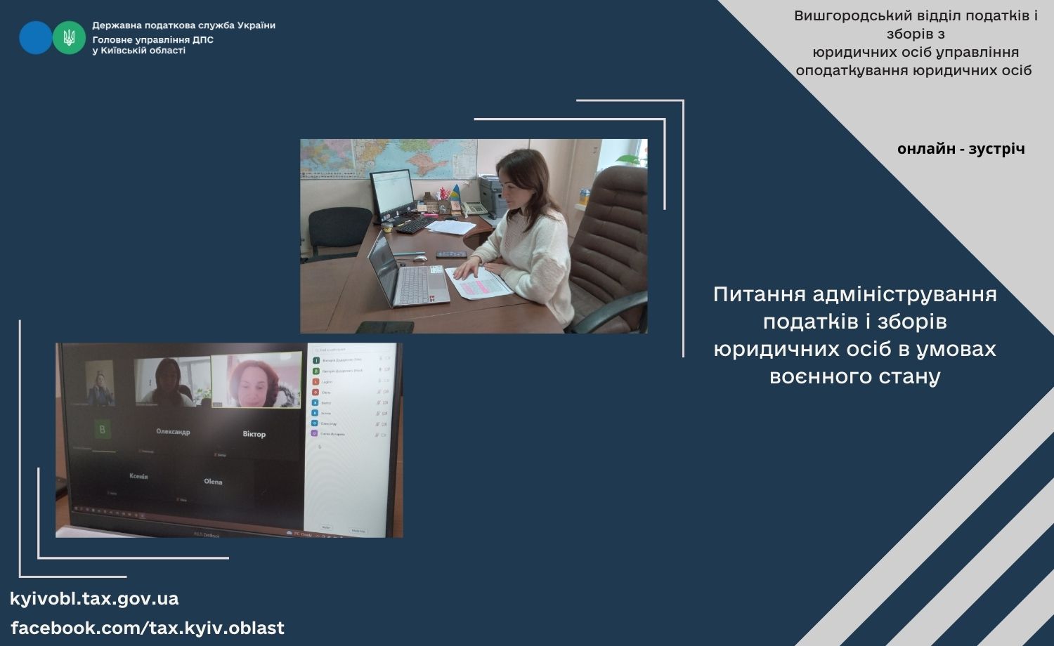 Начальниця Вишгородського відділу податків і зборів з юридичних осіб управління оподаткування юридичних осіб ГУ ДПС у Київській області Вікторія Дударенко провела онлайн - зустріч з платниками податків у форматі відеоконференцзв’язку щодо актуальних питань адміністрування податків і зборів юридичних осіб в умовах воєнного стану.
