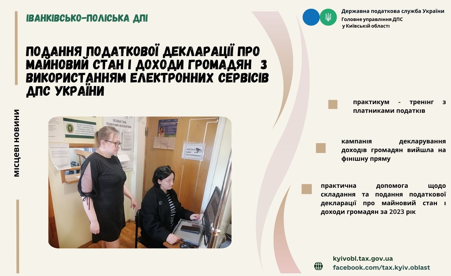 В ході практикуму СДІ Іванківсько-Поліської ДПІ Яна Кузьменко повідомила, що кампанія декларування доходів громадян вийшла на фінішну пряму та надала практичну допомогу щодо складання та подання податкової декларації про майновий стан і доходи громадян за 2023 рік в електронній формі через діючий сервіс ДПС України «Електронний кабінет платника податків», рекомендуючи до використання безкоштовний мобільний застосунок «Моя податкова».