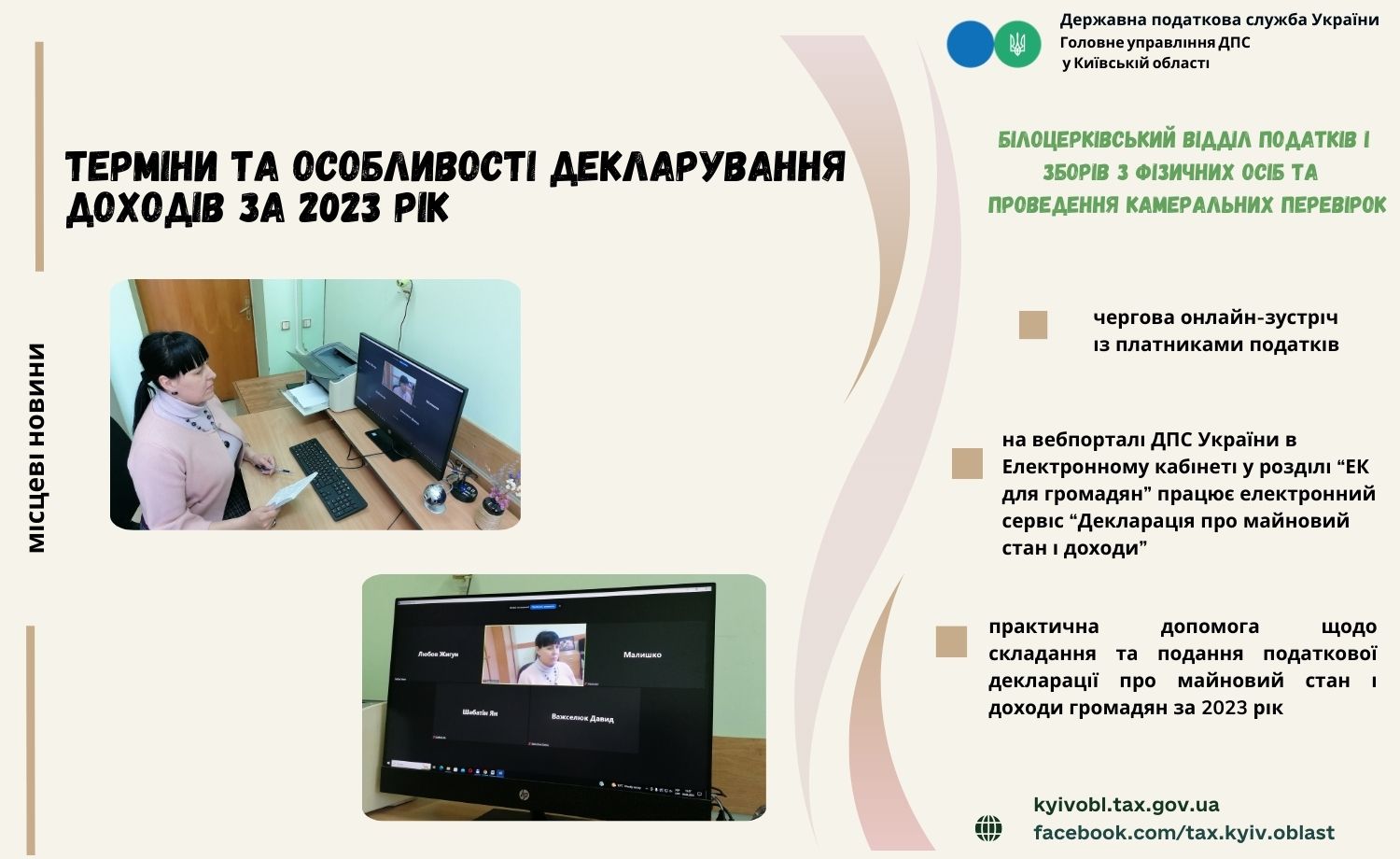 На черговій онлайн - зустрічі з платниками податків, організованій Білоцерківським відділом податків і зборів з фізичних осіб та проведення камеральних перевірок ГУ ДПС у Київській області, Леся Кравченко, виконуюча обов’язки начальника, окреслила терміни та особливості декларування доходів за 2023 рік. Зокрема, до 1 травня 2024 року річну податкову декларацію зобов’язані подати: