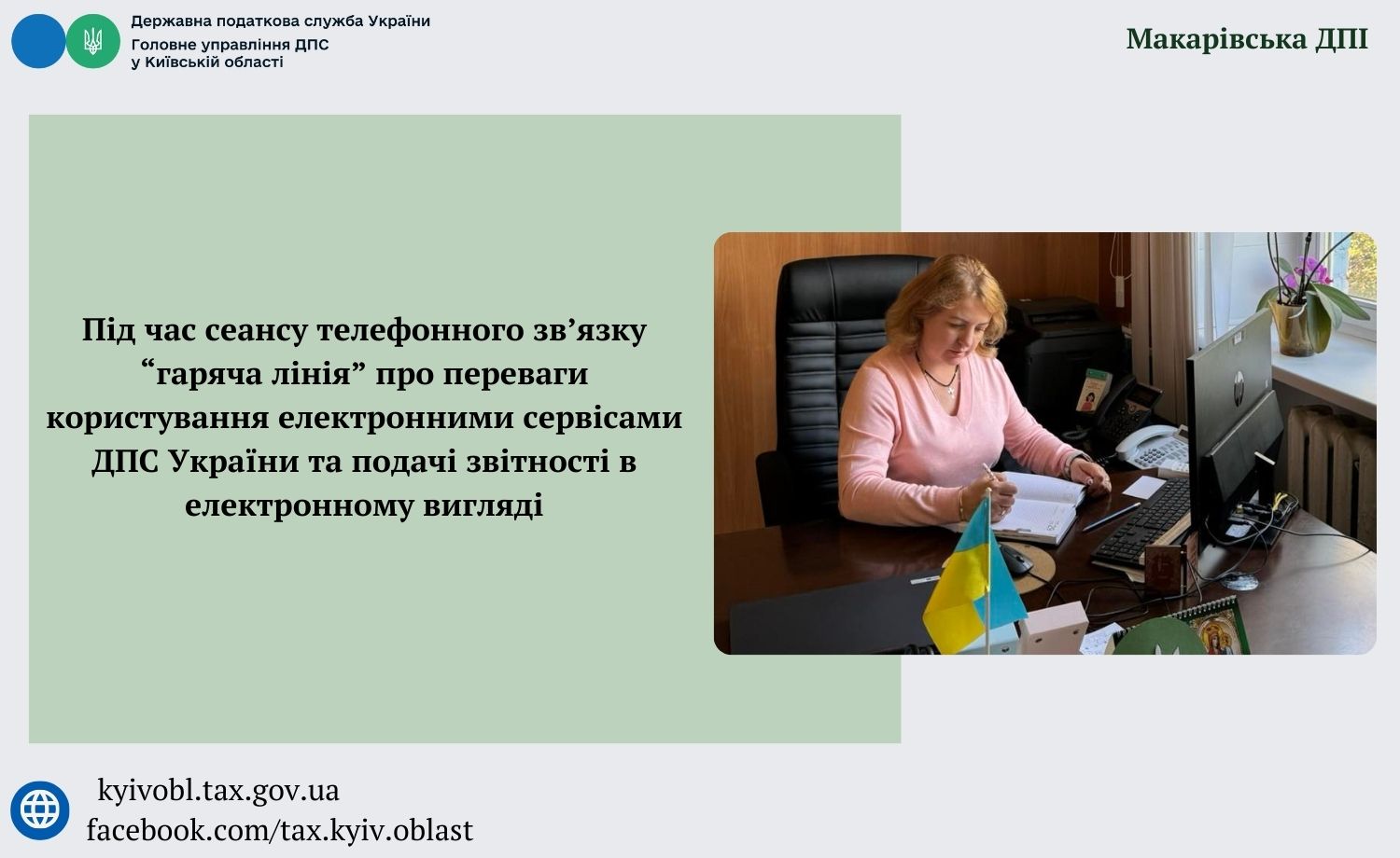 Нещодавно за участі начальника Макарівської ДПІ Лілії Джиги відбувся сеанс телефонного зв’язку «гаряча лінія» щодо переваг користування електронними сервісами ДПС України: «Моя податкова» та Електронний кабінет платника.