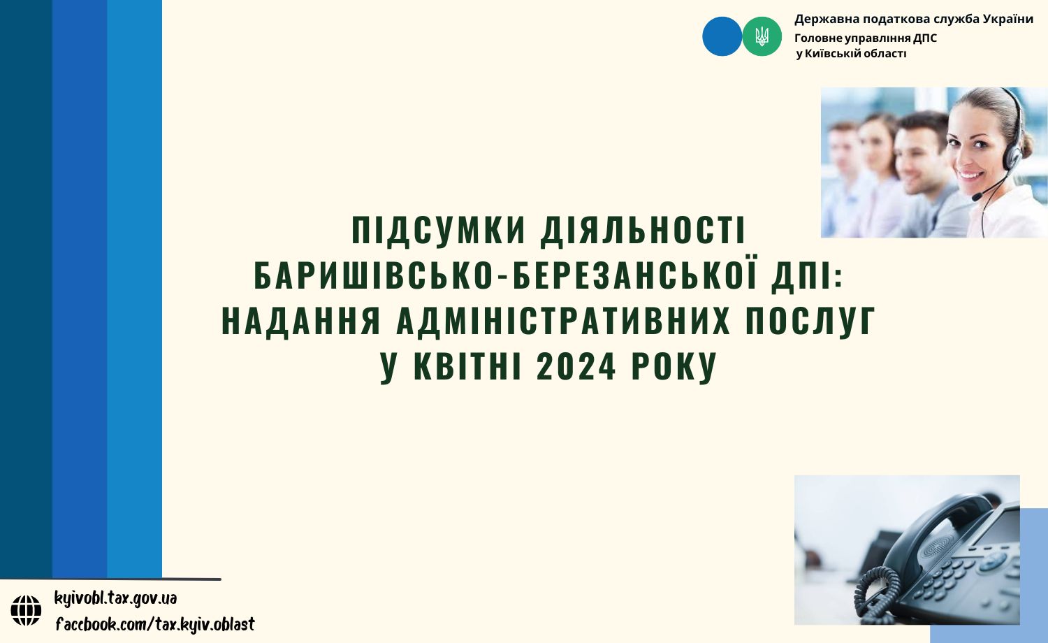 Упродовж квітня місяця 2024 року працівниками Центру обслуговування платників Баришівсько-Березанської ДПІ надана 55 адміністративні послуги в електронній формі. Зареєстровано в електронній формі: 5 реєстраторів розрахункових операцій, 15 програмних реєстраторів розрахункових операцій, 13 книг обліку розрахункових операцій, 12 розрахункових книжок.