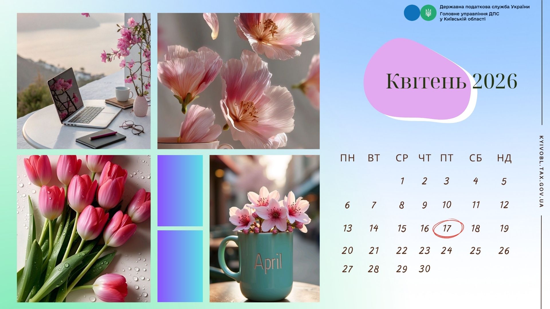 17 квітня 2026 Останній день сплати авансових платежів з податку на доходи фізичних осіб та військового збору фізичними особами – підприємцями, крім осіб, що обрали спрощену систему оподаткування, розрахованих самостійно згідно з фактичними даними, зазначеними у Книзі обліку доходів і витрат Будьте в курсі всіх змін - підписуйтесь на телеграм-канал ДПС: https://t.me/tax_gov_ua