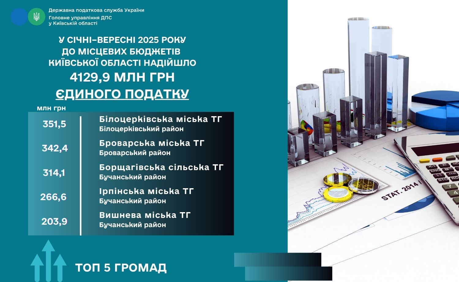 Серед лідерів за обсягами надходжень — Білоцерківська (351,5 млн грн), Броварська (342,4 млн грн), Борщагівська (314,1 млн грн), Ірпінська (266,6 млн грн) та Вишнева (203,9 млн грн) територіальні громади. Ці ТГ демонструють ефективну взаємодію місцевої влади та бізнесу, а також відповідальне ставлення підприємців до сплати податків.