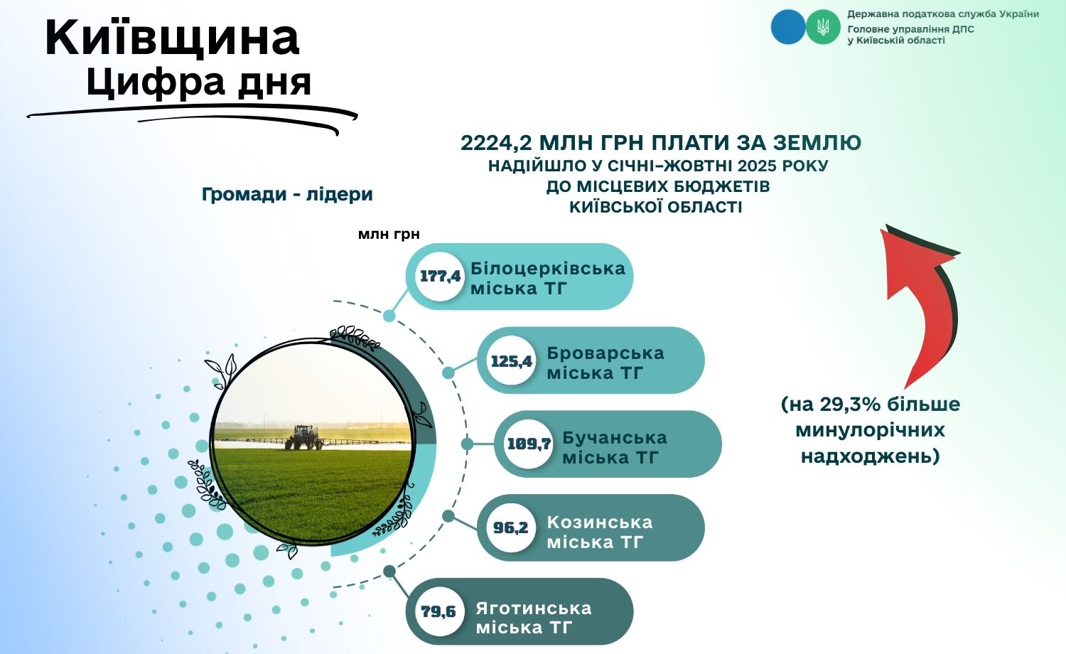 Плата за землю залишається одним із ключових джерел наповнення місцевих бюджетів Київщини. За січень–жовтень 2025 року громади області отримали 2 224,2 млн грн цього платежу — це 7,9 % у структурі всіх місцевих надходжень та 29,3 % приросту до фактичних показників минулого року. Така динаміка свідчить не лише про стабільність земельних ресурсів як бюджетоформуючого активу, а й про відповідальність платників, які сумлінно виконують свої податкові зобов’язання.