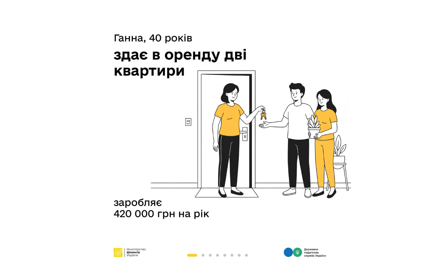 Отже, 40-річна Ганна має кілька однокімнатних квартир, дві з яких здає в оренду. За квартиру в столиці щомісяця вона отримує 20 тис. грн, а за квартиру в Ужгороді – 15 тис. грн (загалом 105 тис. грн/квартал; 420 тис. грн/рік). З метою отримання офіційного доходу  Ганна зареєструвала свою діяльність як ФОП (фізична особа – підприємець) 3 групи єдиного податку. Це дозволяє їй офіційно надавати послуги з оренди громадянам України та іноземцям.