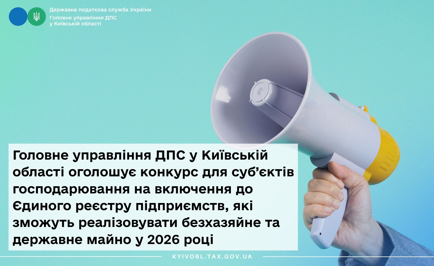 оголошує конкурс для суб’єктів господарювання щодо формування Єдиного реєстру суб’єктів господарювання, які можуть здійснювати реалізацію безхазяйного майна та майна, що переходить у власність держави на 2026 рік.