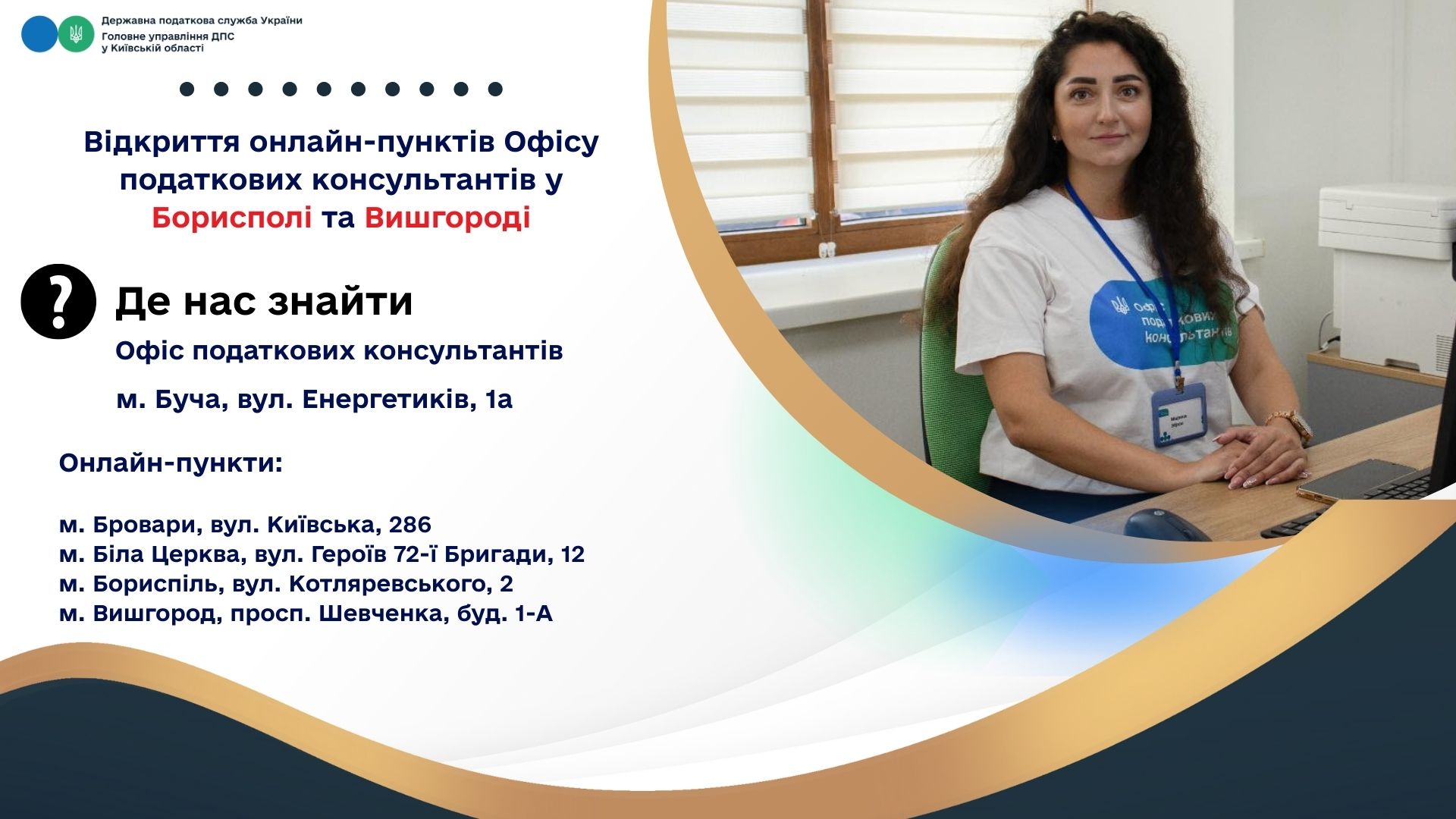Ми раді повідомити про розширення мережі Офісу податкових консультантів та відкриття нових онлайн-пунктів у Борисполі та Вишгороді.