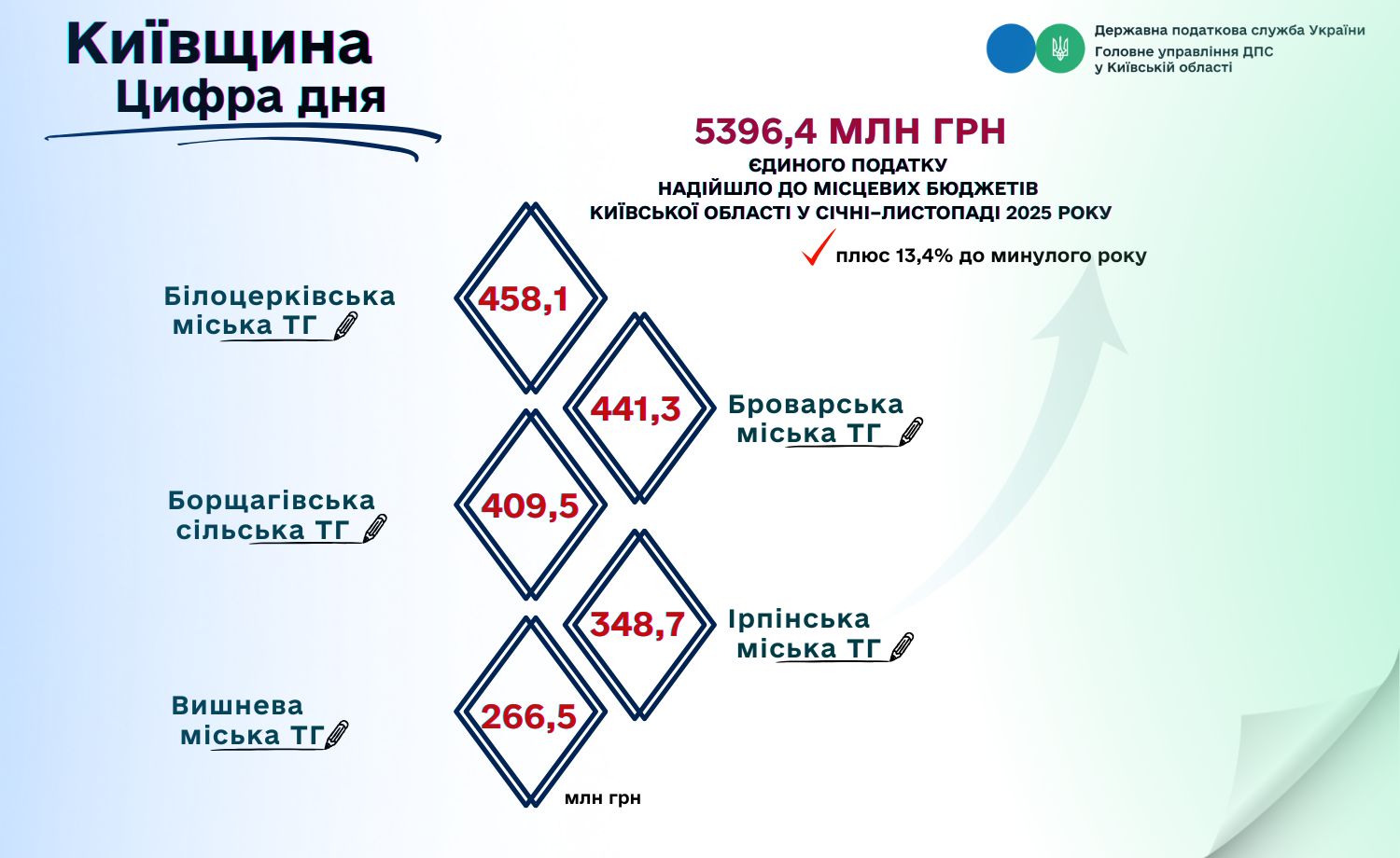 За січень–листопад 2025 року до місцевих бюджетів надійшло 5 396,4 млн грн єдиного податку, що становить 17,1 % у структурі всіх надходжень. Порівняно з аналогічним періодом 2024 року цей показник зріс на 13,4 %, що підтверджує стабільність малого та середнього бізнесу — основних платників цього податку.