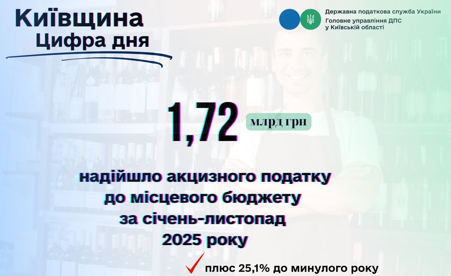 За підсумками 11 місяців поточного року до місцевих бюджетів Київської області надійшло 1 717,8 млн грн акцизного податку. Частка цього платежу у структурі доходів місцевих бюджетів становить 5,4 %, а темп зростання у порівнянні з відповідним періодом 2024 року — +25,1 %. Така динаміка свідчить про стабільне наповнення бюджетів і зростання відповідальності суб’єктів господарювання, що працюють на ринку підакцизних товарів.