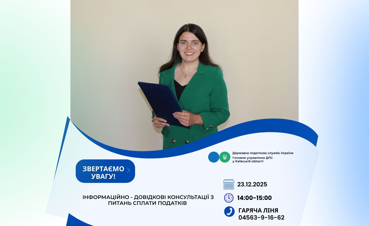 Звертаємо увагу платників податків, що ви можете отримати первинні інформаційно – довідкові консультації з питань сплати податків та повернення помилково та/або надміру сплачених сум 23 грудня 2025 з 14:00 до 15:00 за телефоном «гарячої лінії»: 04563-9-16-62.