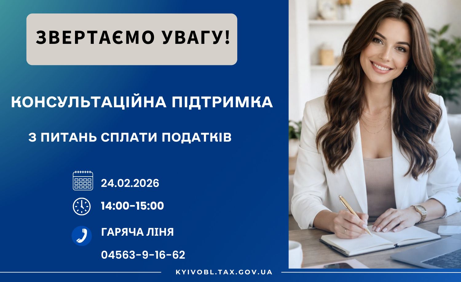 Звертаємо увагу платників податків, що ви можете отримати роз’яснення з питань сплати податків та повернення помилково та/або надміру сплачених сум 24 лютого 2026 з 14:00 до 15:00 за телефоном «гарячої лінії»: 04563 91662.