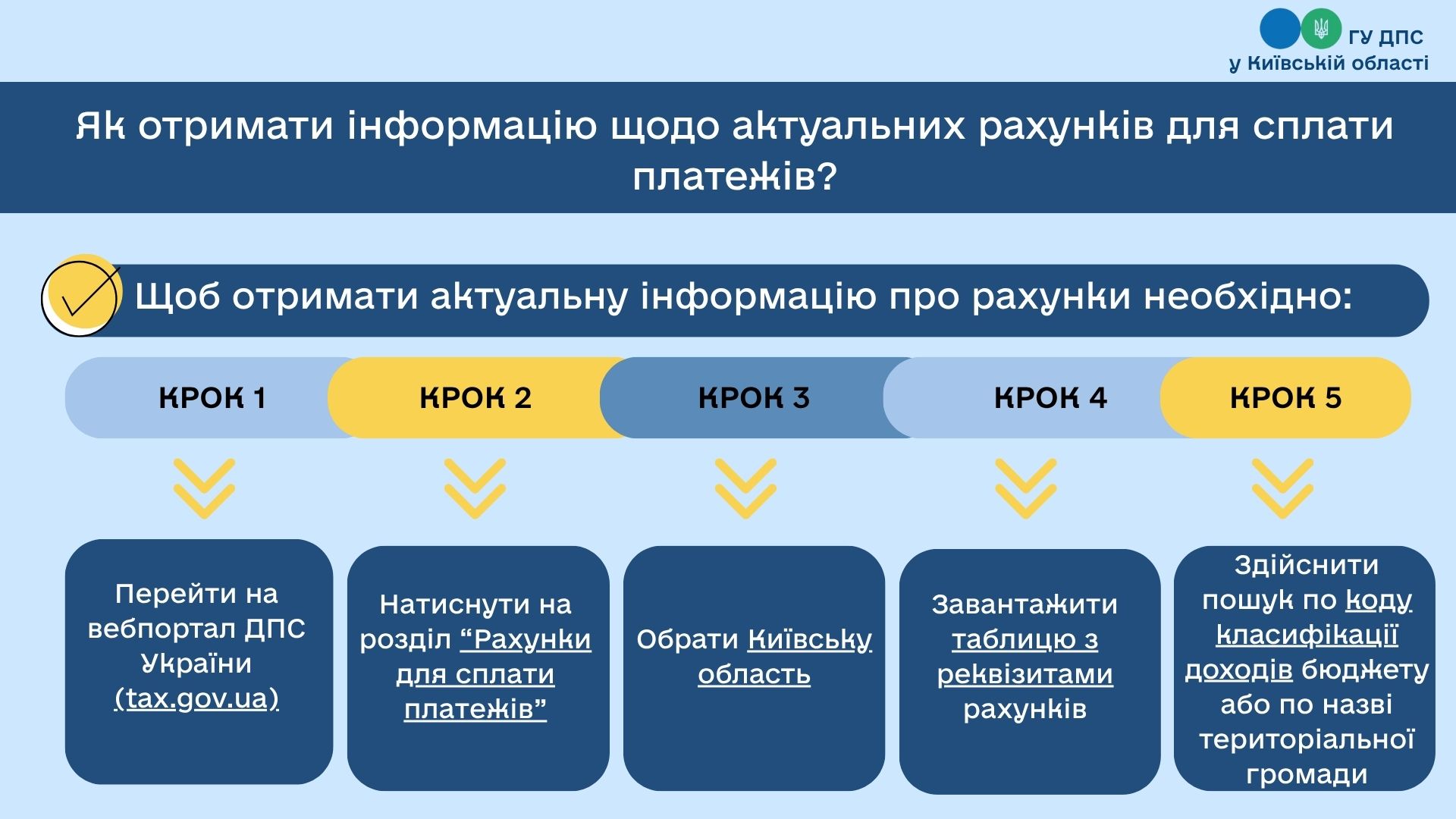 Головне управління ДПС у Київській області повідомляє, що з реквізитами рахунків для зарахування платежів до загального фонду державного бюджету можна ознайомитись на субсайті ГУ ДПС у Київській області в розділі «Рахунки для сплати платежів» або на вебпорталі ДПС. У розділі «Рахунки для сплати платежів» можна знайти інформацію про: 1. Реквізити рахунків для сплати податків, зборів та платежів до державного та місцевих бюджетів по Київській області. 2. Реквізити рахунків для сплати єдиного внеску на загальнообов’язковедержавне соціальне страхування по Київській області. Більше інформації за посиланням: https://kyivobl.tax.gov.ua/rahunki-dlya-splati-platejiv